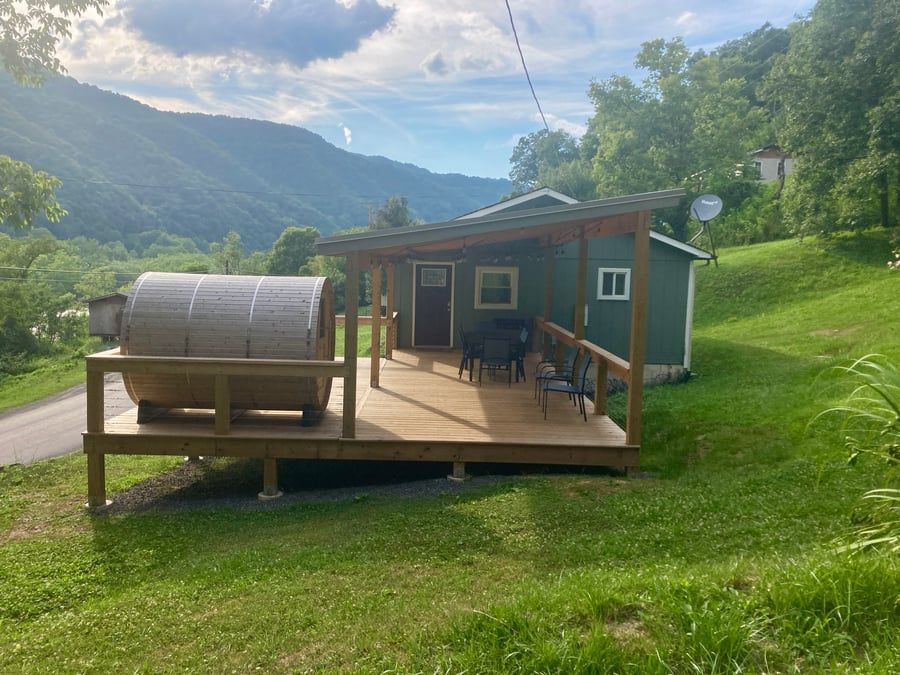 Step outside to a 30 by 22-foot deck that is partially covered and includes a patio set, barrel sauna, and Blackstone grill. Check availability and book directly on our